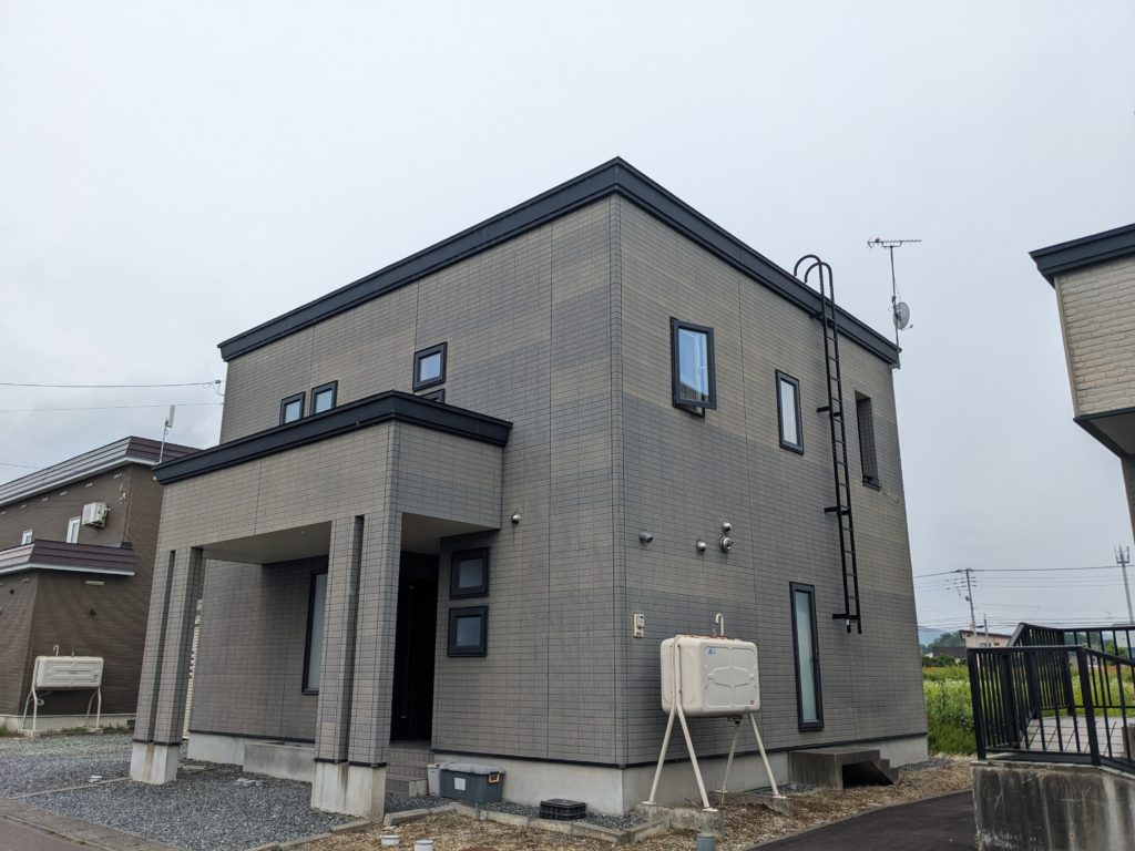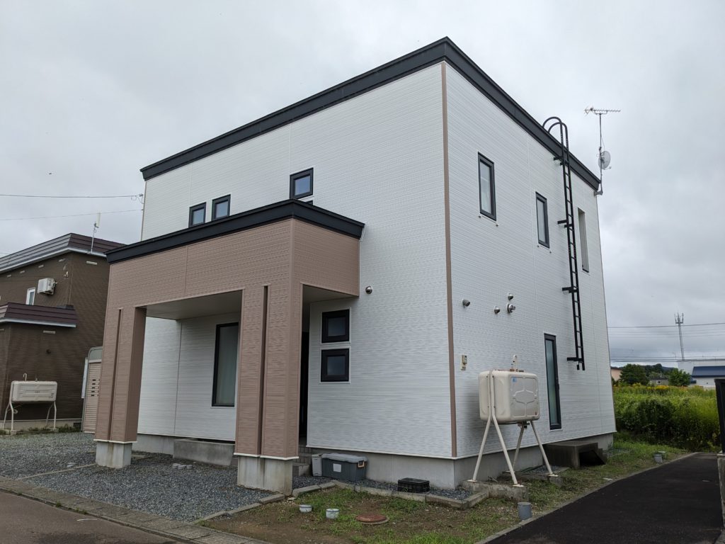 アクセントで出隅カバーの前後四隅と玄関前をスモークブラウンで施工しました。